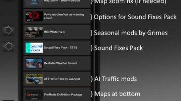 * Traffic behavior mods (in lower priority in Mod Manager) can enable realistic sound ranges plugin from Sound Fixes Pack by inserting this line into def/traffic_data.sii: @include “traffic_data_update.sui”