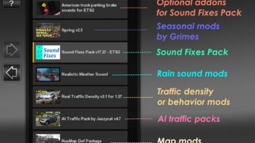 * Traffic density/behavior mods (in lower priority in Mod Manager) can enable realistic sound ranges plugin from Sound Fixes Pack by inserting this line into def/traffic_data.sii: @include “traffic_data_update.sui”