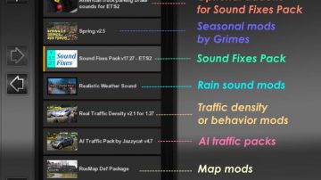 * Traffic density/behavior mods (in lower priority in Mod Manager) can enable realistic sound ranges plugin from Sound Fixes Pack by inserting this line into def/traffic_data.sii: @include “traffic_data_update.sui”
