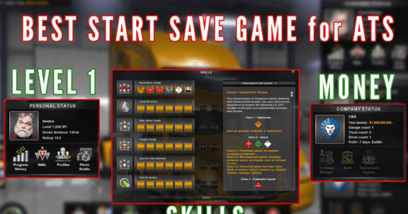 This is a starter savegame for ATS beginners (and not). Perfect if you want to play ATS with already a lot of money and all the skills.