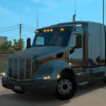 Changed all interior textures to improve similarity to real life truck (used high-res textures) – plastic, wood, fabric, leather parts, floor mat, interior lamps, Peterbilt logo on wheel and radio;