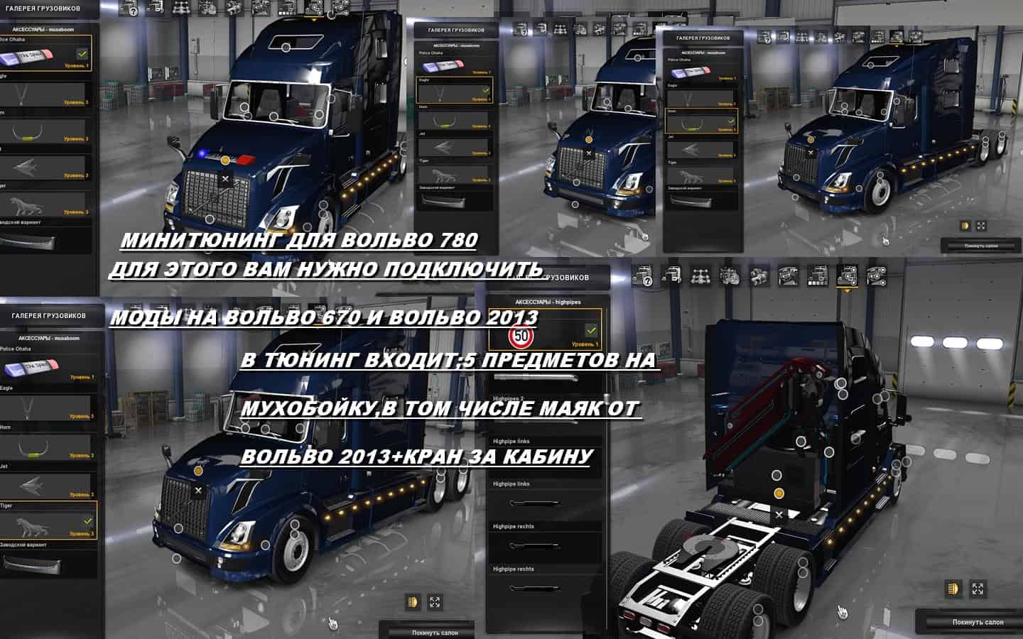 Adds accessories for Volvo vnl 780. To do this, you need to connect as fashion Volvo VNL 670 and Volvo 2013. The accessories include the following items; 5 items on the fly swatter on the hood, including a lighthouse from 2013 + Volvo crane behind the cab.