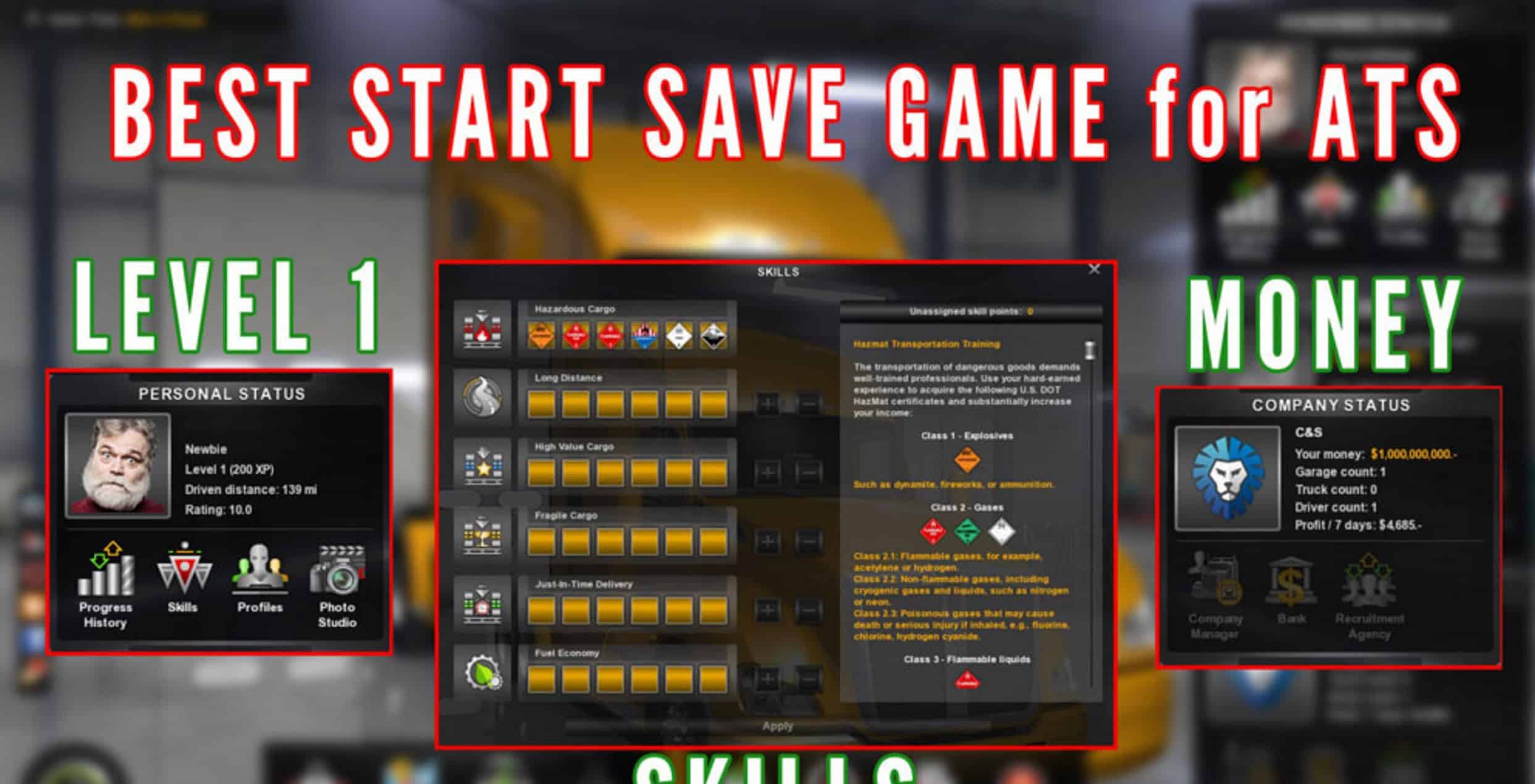 – Level 1 [All skill points are maxed] – 1,000,000,000€ Cash [To buy all the trucks you want] – Tested with ATS last version [should work for all versions] – How to Install: