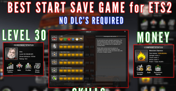 This is a starter savegame for ATS beginners (and not). Perfect if you want to play ATS with already a lot of money and all the skills.