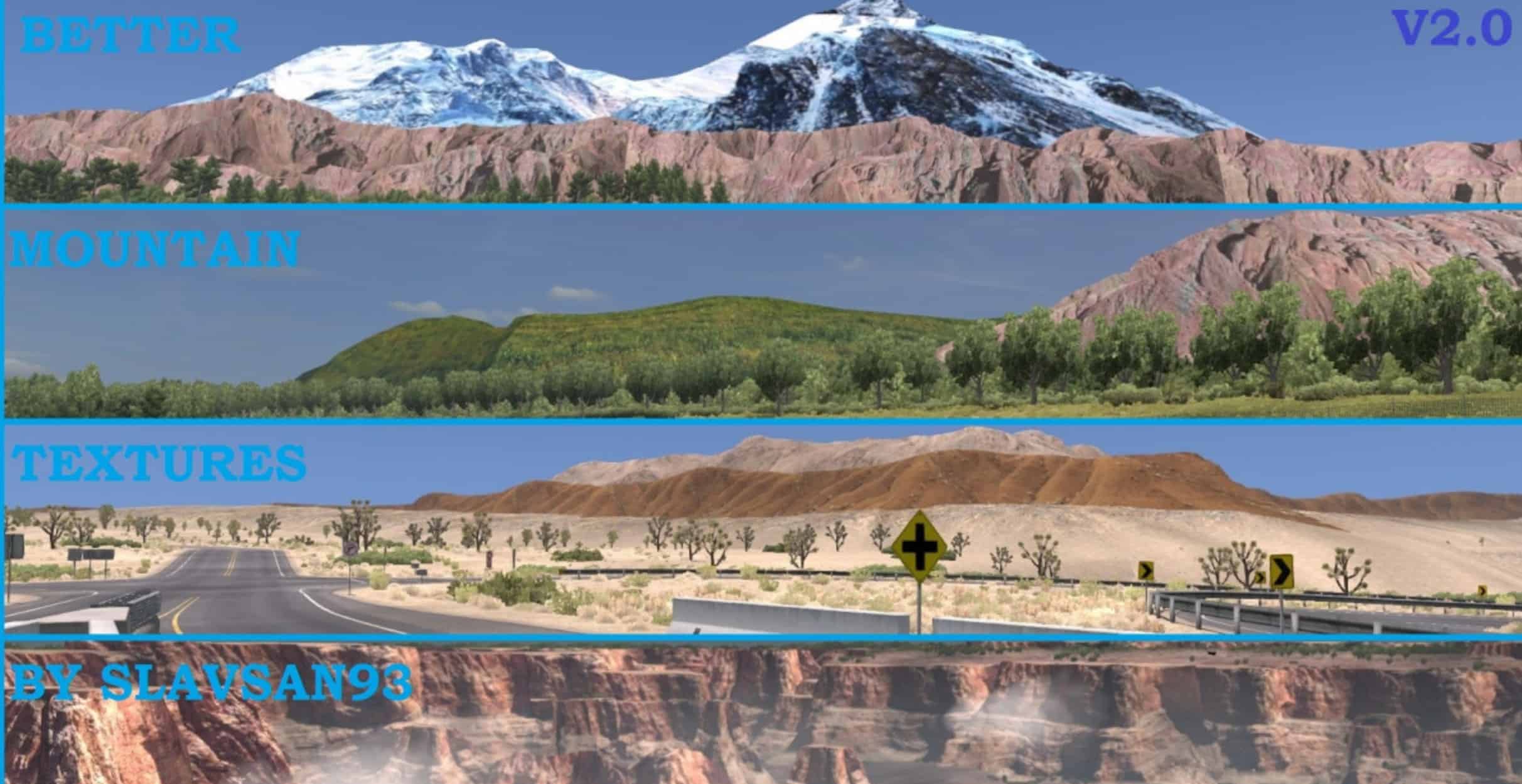 This mod for American Truck Simulator replaces textures for mountains that are used in most of the game’s map for a more realistic look. Enjoy!
