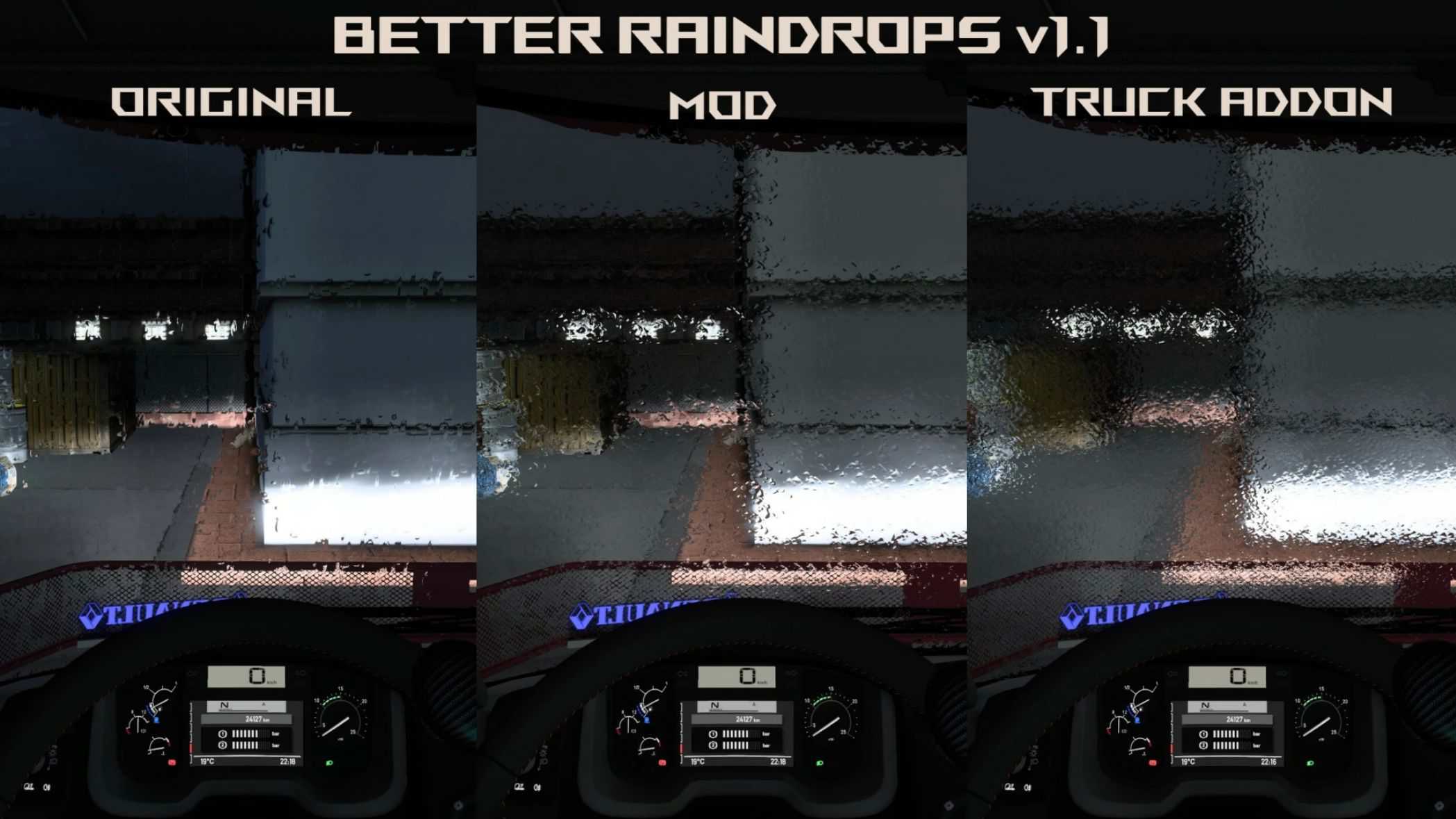 – Improved physical behaviour of raindrops particles, now their spawn is affected by truck position relatively to rain inclination.