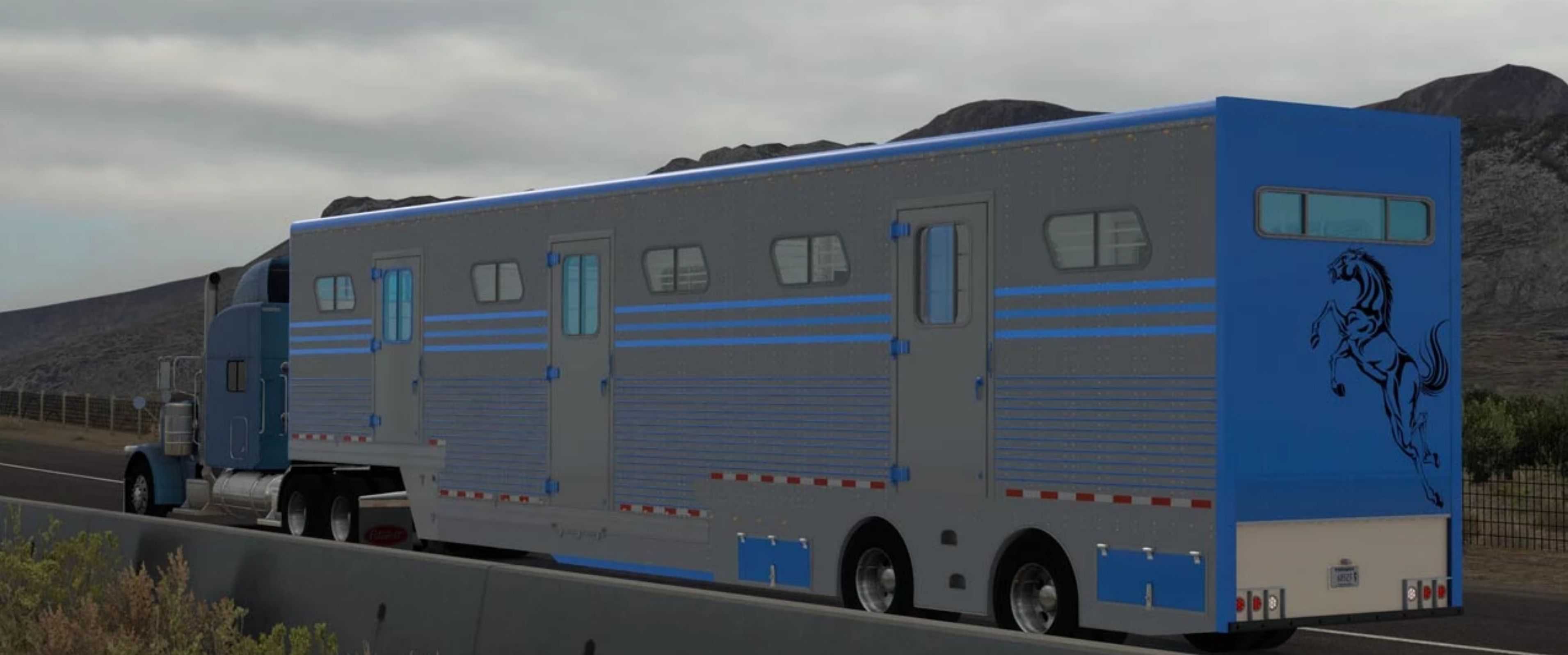 Transport multiple horses in ultimate comfort with this highly customizable trailer. From paintable skins to adjustable chassis and glass colours, personalize every detail to your liking. The trailer features internal lighting with changeable colours, allowing you to watch your animals even at night time.