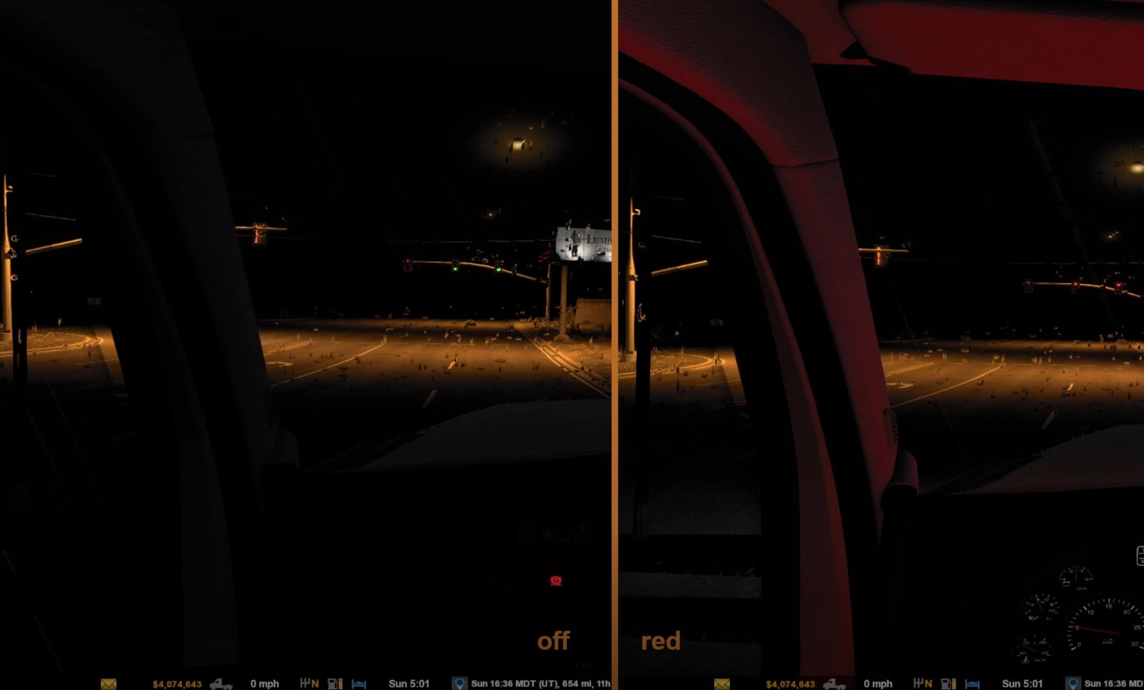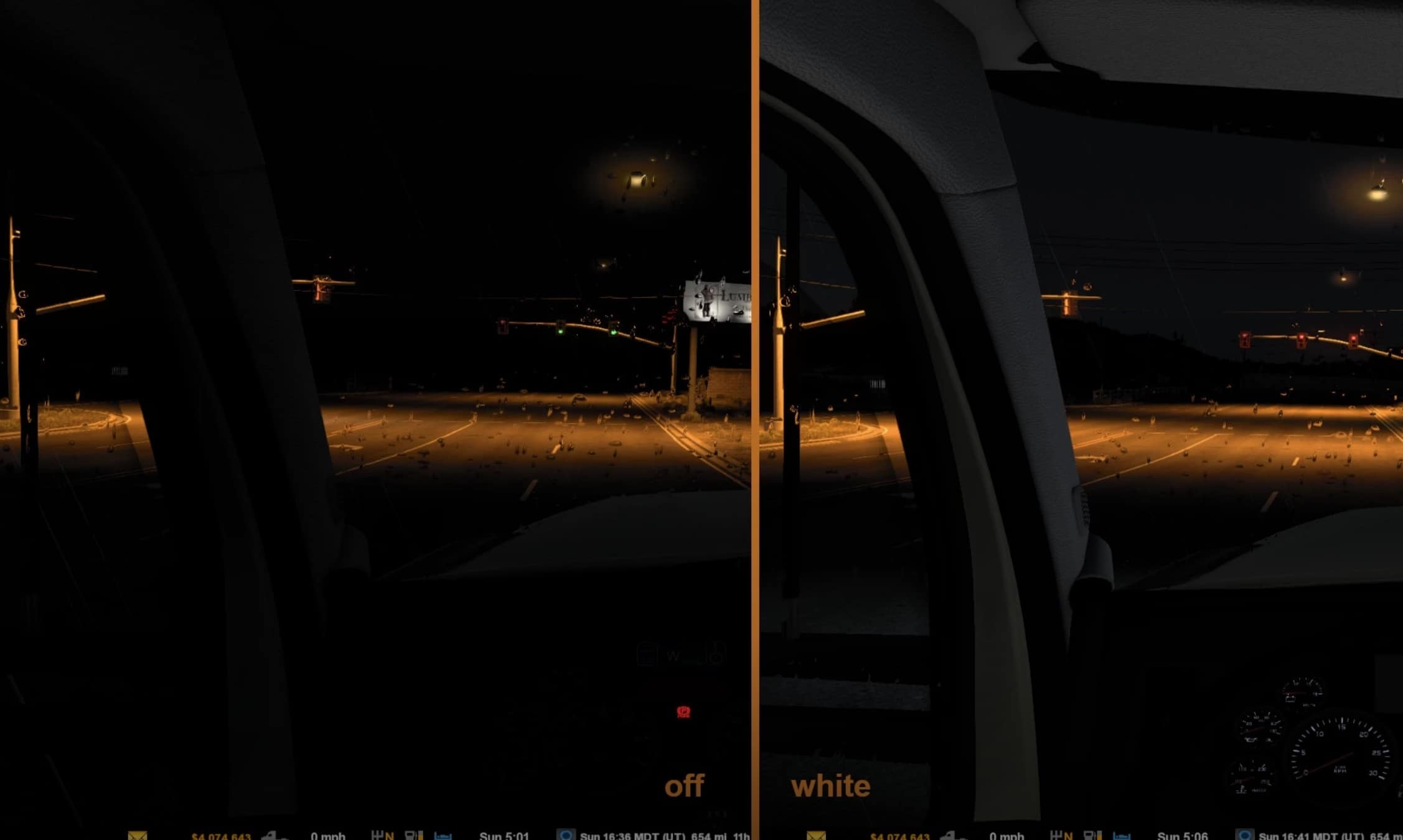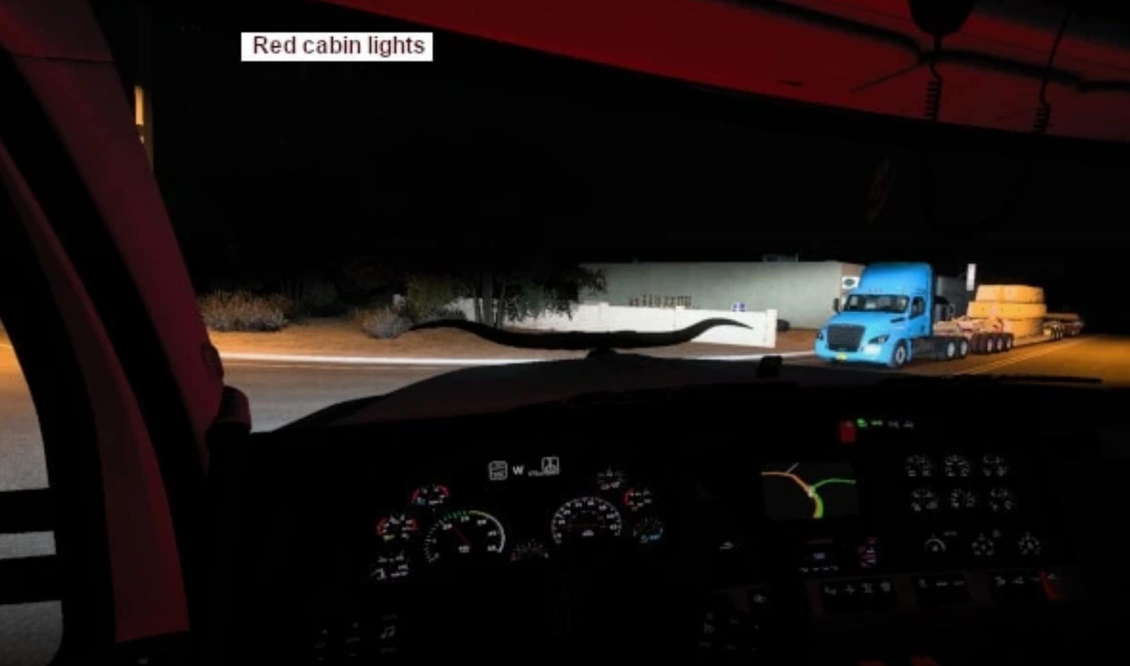 This mod provides interior cabin-light glow in choice of blue, green, orange, purple, red, and white for SCS trucks and mod trucks listed below.