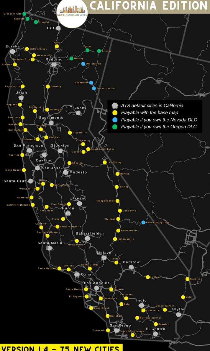 The version 1.4 activates 11 additionnal cities across California. The edition is now fully developed. BASE GAME dependency.