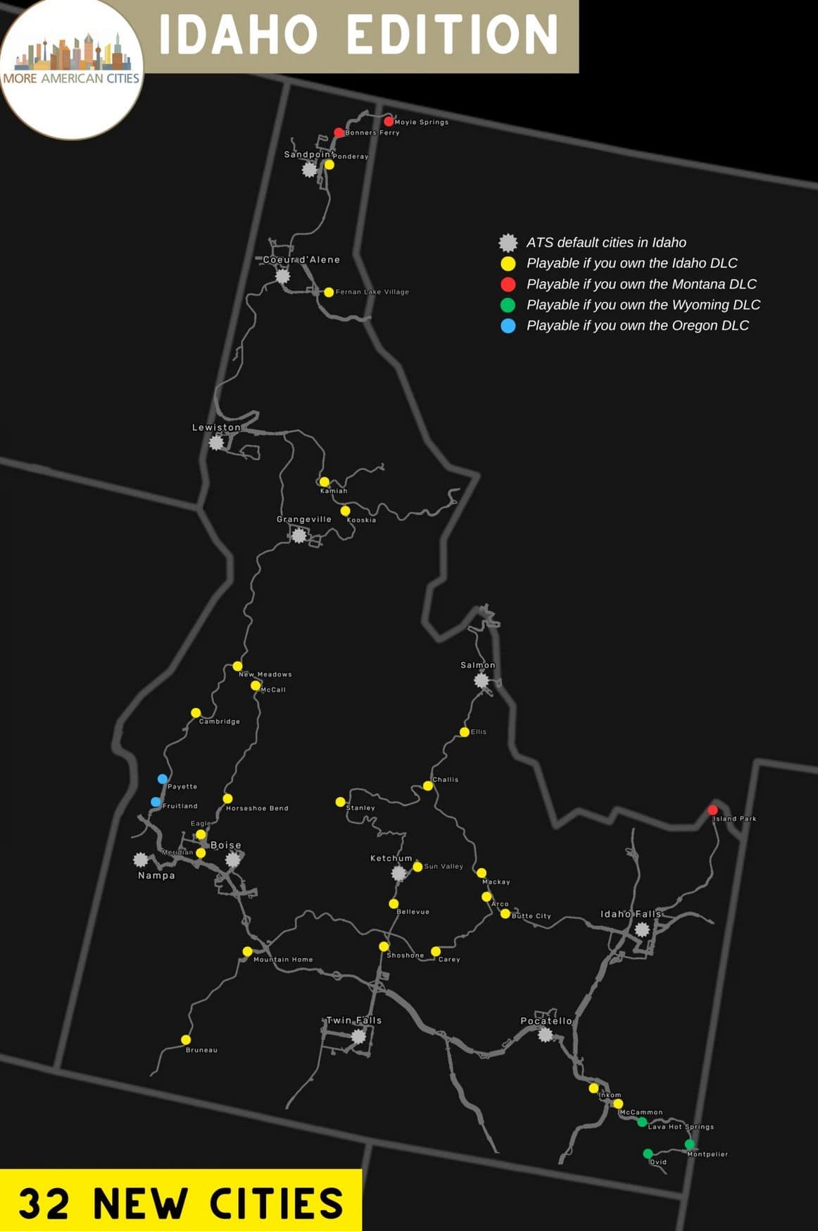 Please note that if you do not have the map extensions bordering the state of Idaho, some towns will not be playable despite their presence on the map.