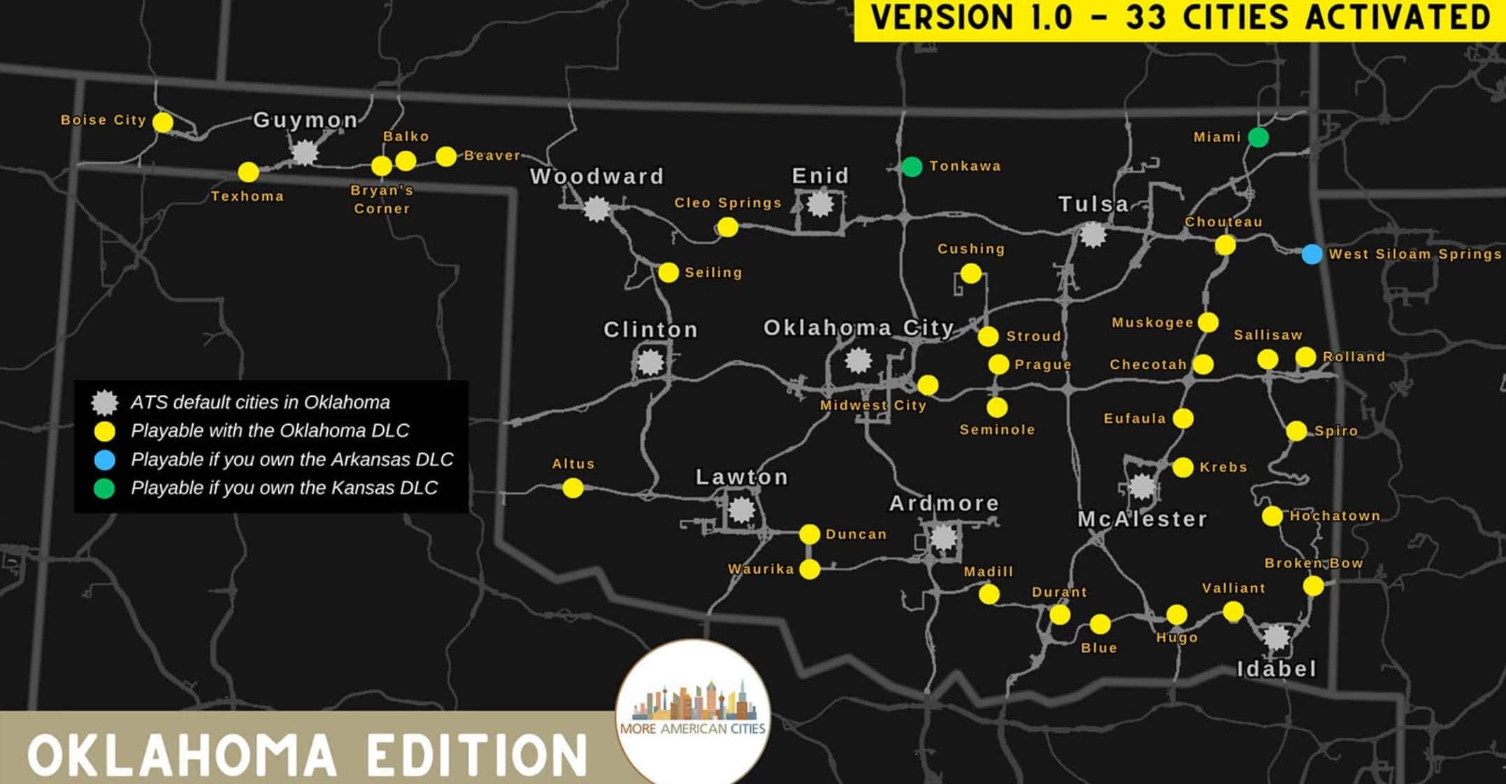 Please note that if you do not have the map extensions bordering the state of Oklahoma, some towns may not be playable despite their presence on the map.