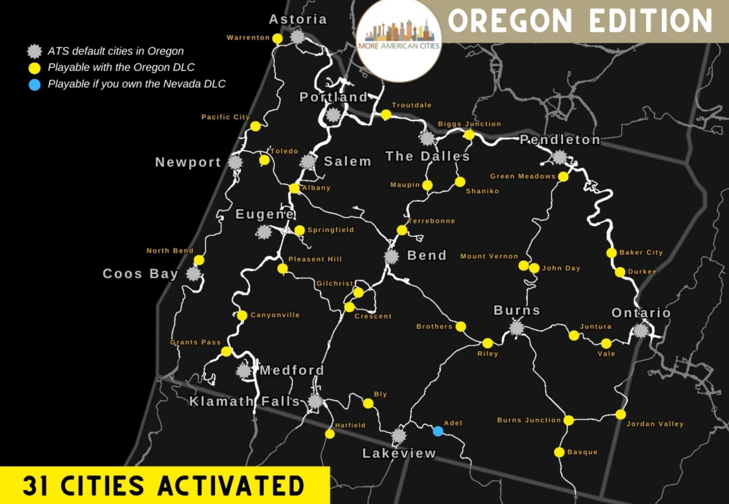 Activating 31 decorative cities accross Oregon state : Adel, Albany, Baker City, Basque, Biggs Junction, Bly, Brothers, Burns Junction, Canyonville, Crescent, Durkee, Gilchrist, Grants Pass, Green Meadows, Hatfield, John Day, Jordan Valley, Juntura, Maupin, Mount Vernon, North Bend, Pacific City, Pleasant Hill, Riley, Shaniko, Springfield, Terrebonne, Toledo, Troutdale, Vale and Warrenton.