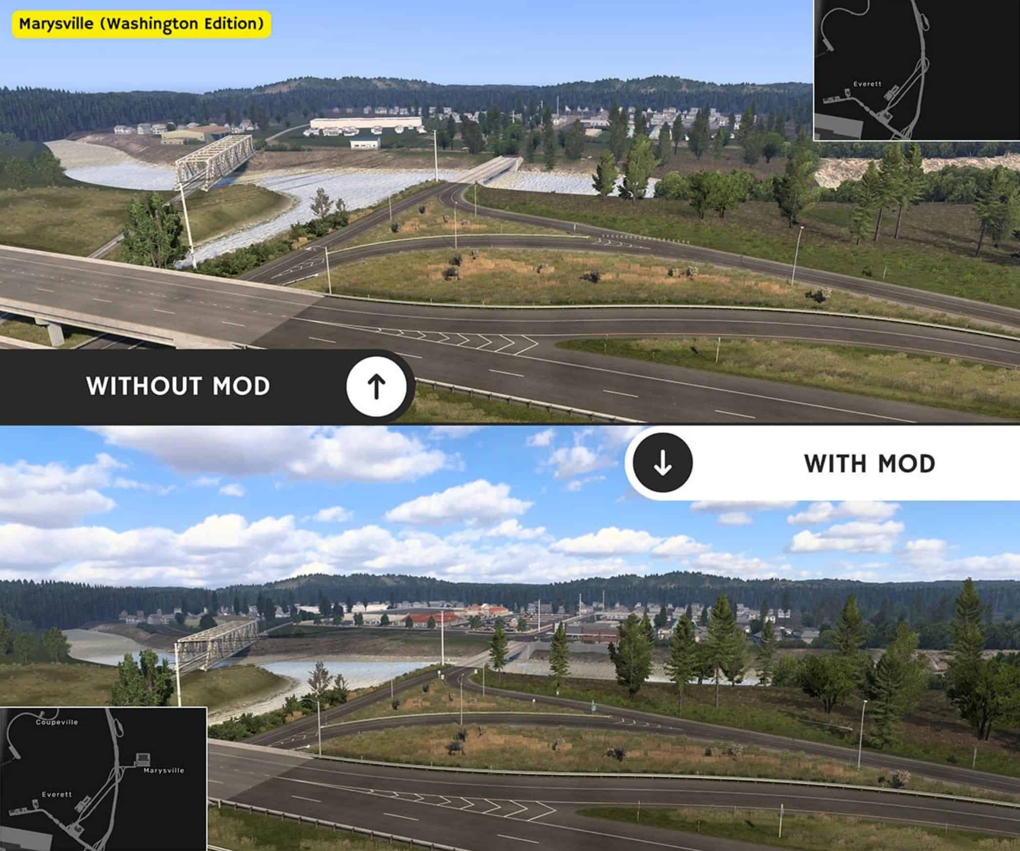 This mod makes some of the decorative towns featured on the base map playable using existing or brand-new delivery points. I advise you to place all the “More American Cities” mods as low down as possible in your mod manager to avoid any conflict with other modded maps. If you use more than one edition, please arrange them alphabetically in your mod manager, where A is at the top and Z is at the bottom. Please note that if you do not have the map extensions bordering the state of Washington, some towns will not be playable despite their presence on the map.