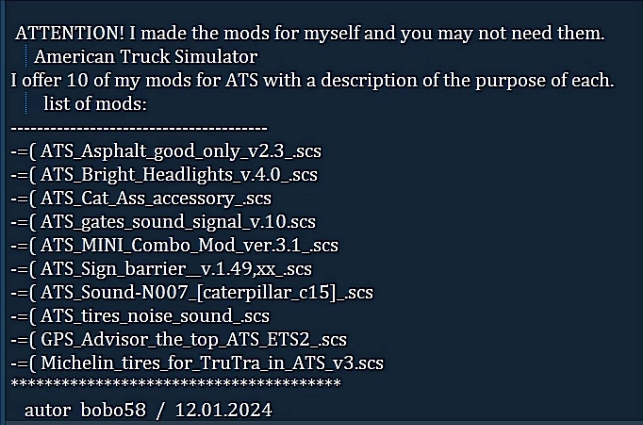I offer 10 of my mods for ATS with a description of the purpose of each.