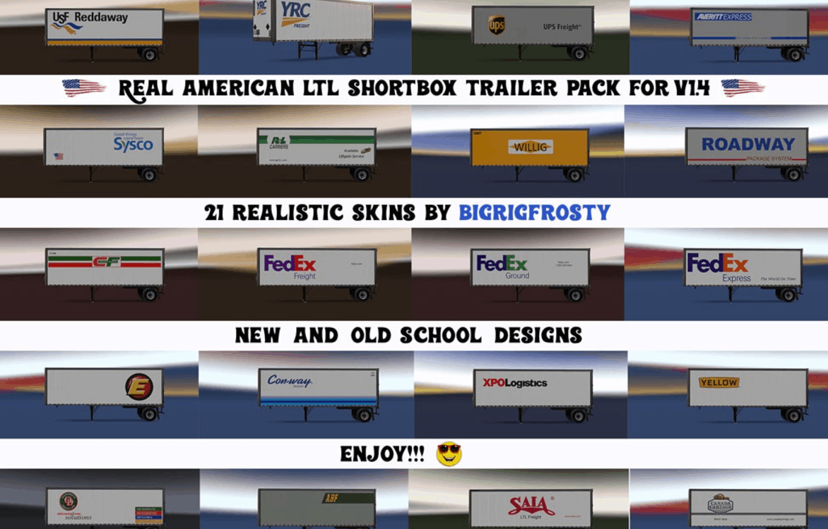 21 realistic skins for American LTL Companies, you will see new and old school schemes from the most popular US companies in the trucking industry.