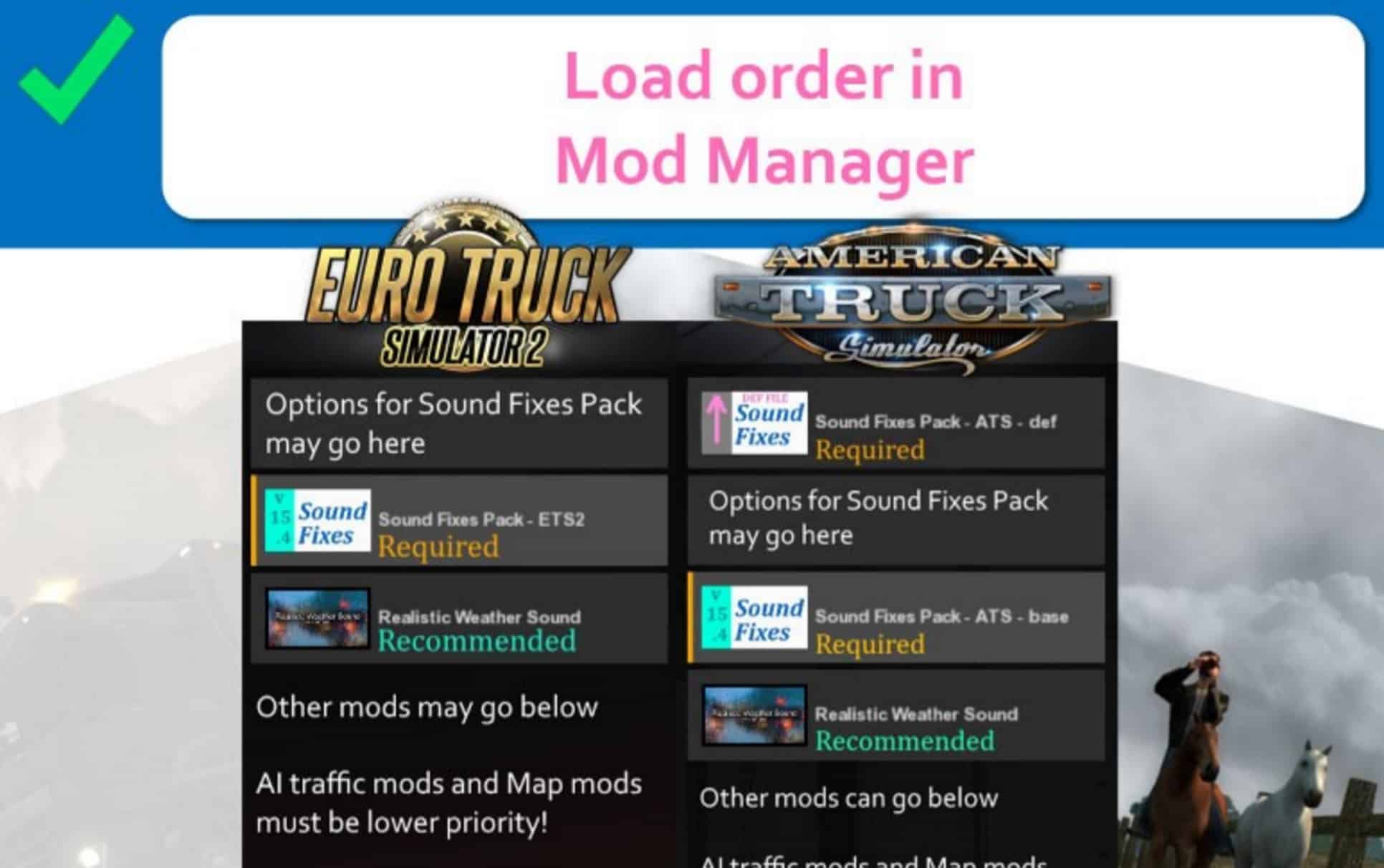 At minimum, mod requires higher priority than map mods and AI traffic mods for correct operation of sounds.