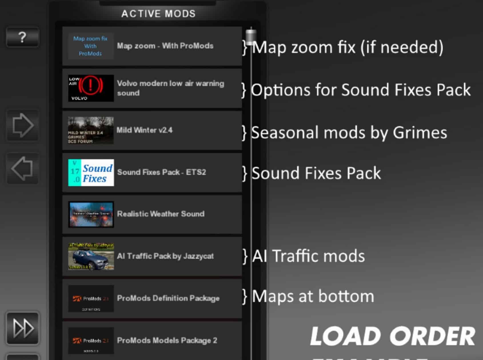 * Traffic behavior mods (in lower priority in Mod Manager) can enable realistic sound ranges plugin from Sound Fixes Pack by inserting this line into def/traffic_data.sii: @include “traffic_data_update.sui”