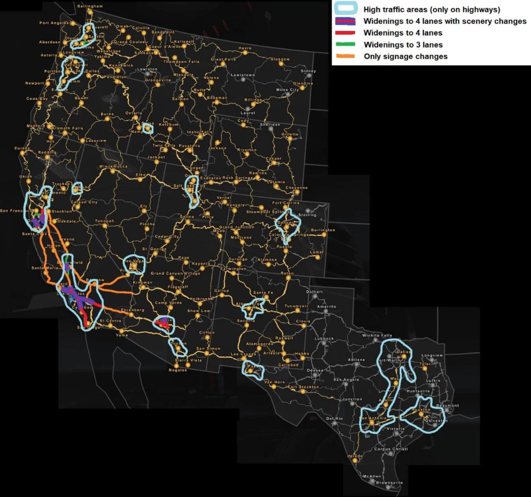This mod greatly increases traffic density in major urban areas across the map; traffic elsewhere is kept to vanilla levels, which I think is realistic enough. It also widens freeways and urbanizes some areas that are particularly inaccurate in the original map. Use the available “Lite” version if you want only the scenery/signage changes in California and Phoenix Area.