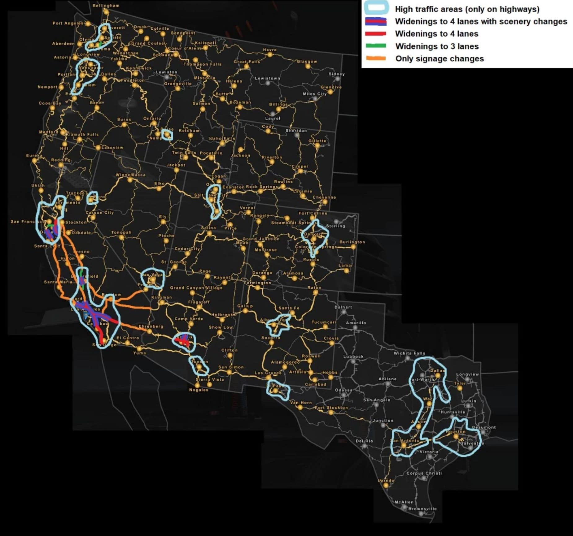 This mod greatly increases traffic density in major urban areas across the map; traffic elsewhere is kept to vanilla levels, which I think is realistic enough. It also widens freeways and urbanizes some areas that are particularly inaccurate in the original map. Use the available “Lite” version if you want only the scenery/signage changes in California and Phoenix Area.