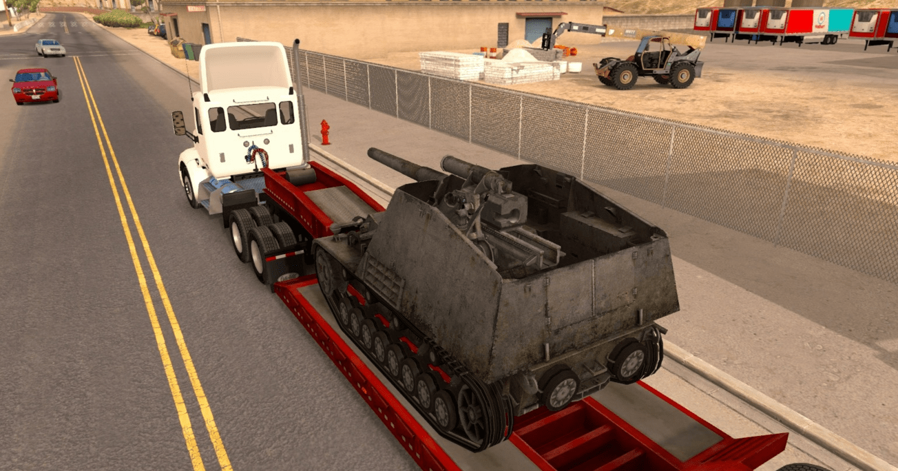 This is a standalone lowboy trailer mod that has a Hummel mobile artillery as cargo.